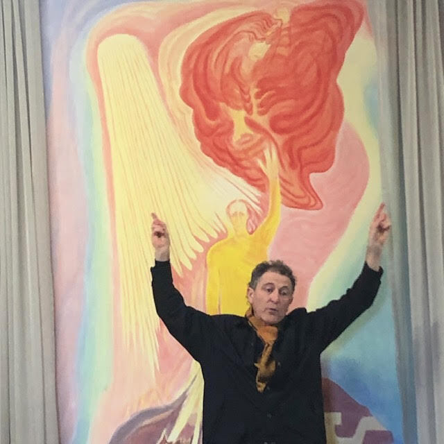 Norbert Mulholland speaking yesterday about the mural behind him that he copied (30 years ago) from photos of the original painted by Rudolf Steiner on the cupola of the first Goetheanum.