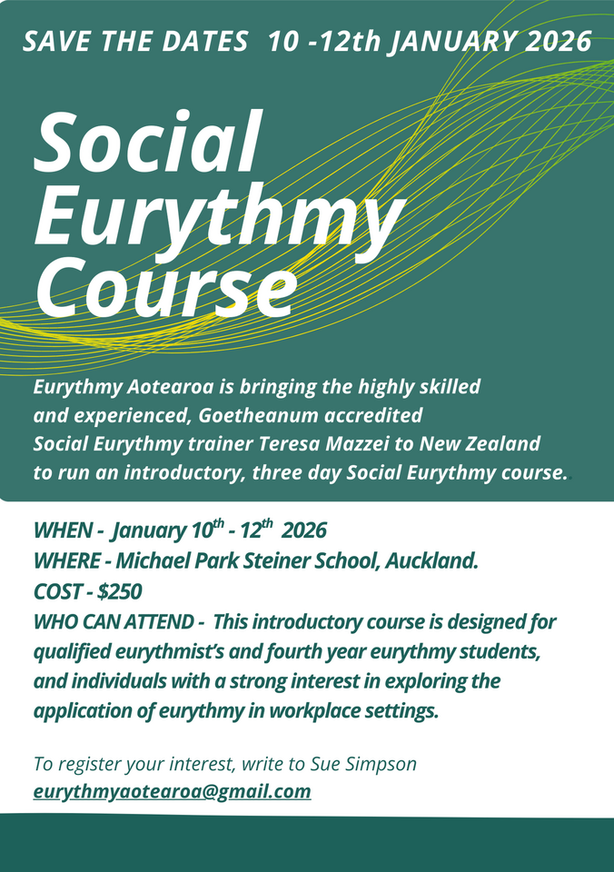 - Weekend 10-12 January. Social Eurythmy with Teresa Mazzei at Michael Park School, Ellerslie**.