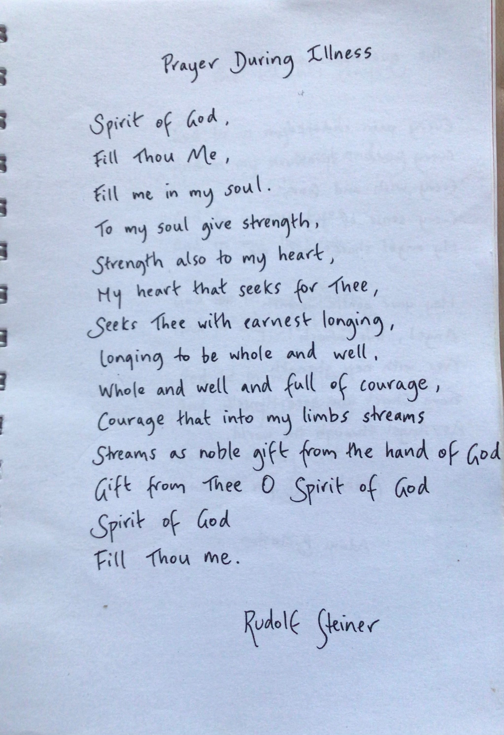 The prayer below was given to Robert by either Dr Ken Friedlander or Peggy, who was Matron of the Hohepa school when Robert received his diagnosis. Rosie writes: “Interestingly, Robert was not an anthroposophist or would have called himself a Christian at that time but I remember him going to a quiet space on the hill behind our little cottage in Main Street and learning it before we went up to Auckland for his surgery and where he spent months in hospital. It became a very powerful and protective mantra for him. And has been all his life. He would be very happy for you to mention it or include it in the newsletter. Over the course of his life, he gave it to so many people who he thought would be helped by it.”
