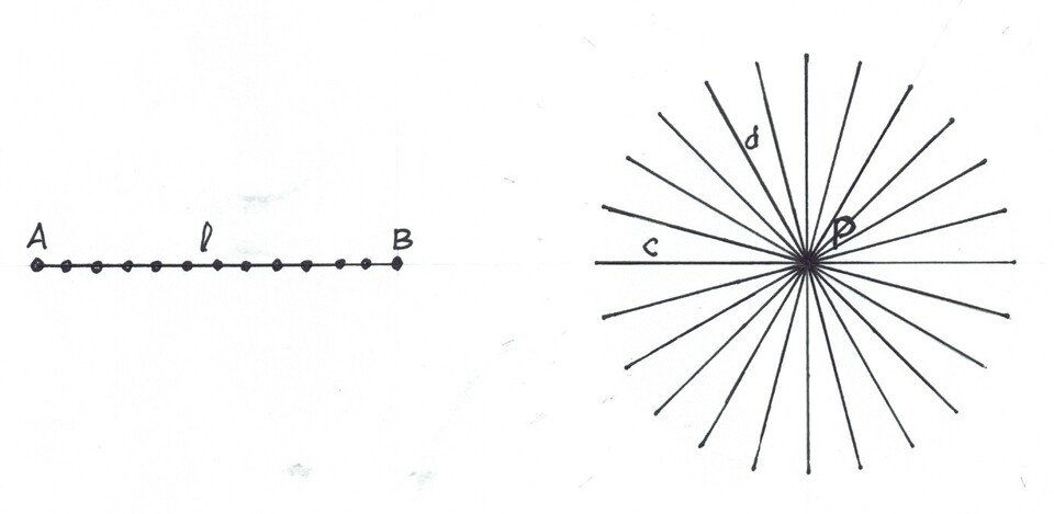 The Line uniting two Points contains myriad points (only a few are shown in the diagram). Bringing it into action, we could say the a moving point starting at A traces out a line, l, of intermediate points on its way to B. The Line holds or contains all the points.
