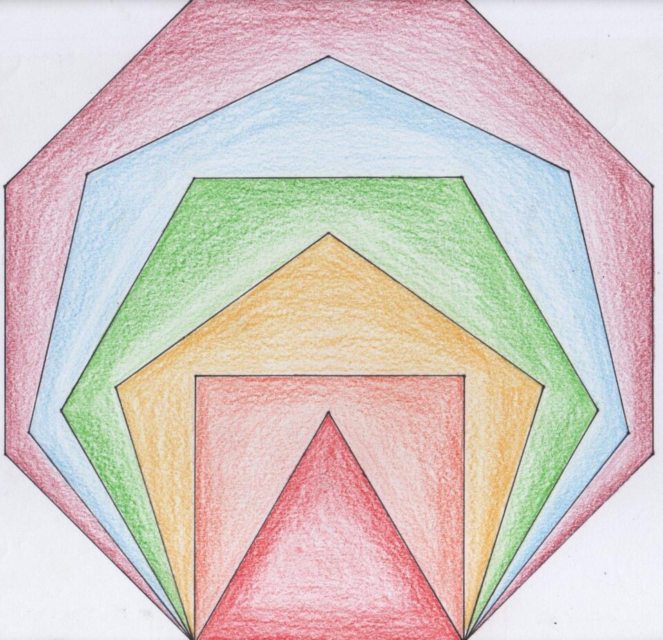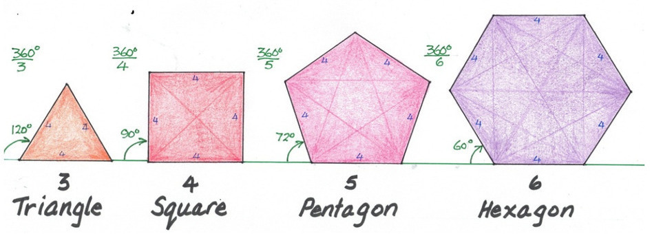 To describe a form, we could count the number of steps, the length of each line between points and the angle of rotation between the lines at each point. In the following diagram of a random, irregular pentagon, a clockwise rotation is measured as positive (+), anticlockwise as negative (-). A complete turn is 360º. The names of these figures are derived from Greek and Latin (see chart of words with numbers in them) so we start with 3 – triangle, 4 – quadrangle, quadrilateral or square, 5 – pentagon, 6 – hexagon, and so on. Let us look at one of the simplest forms: TRIANGLES.