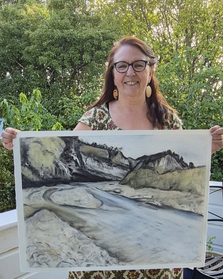 Margaret-Mary with “Winding Towards Dutch Creek” “See the cliffs rising up and the river being pulled towards them.” -using charcoal, and pigments created from lupins, red cabbage, grey wacke, Makaroro umber, chalk.