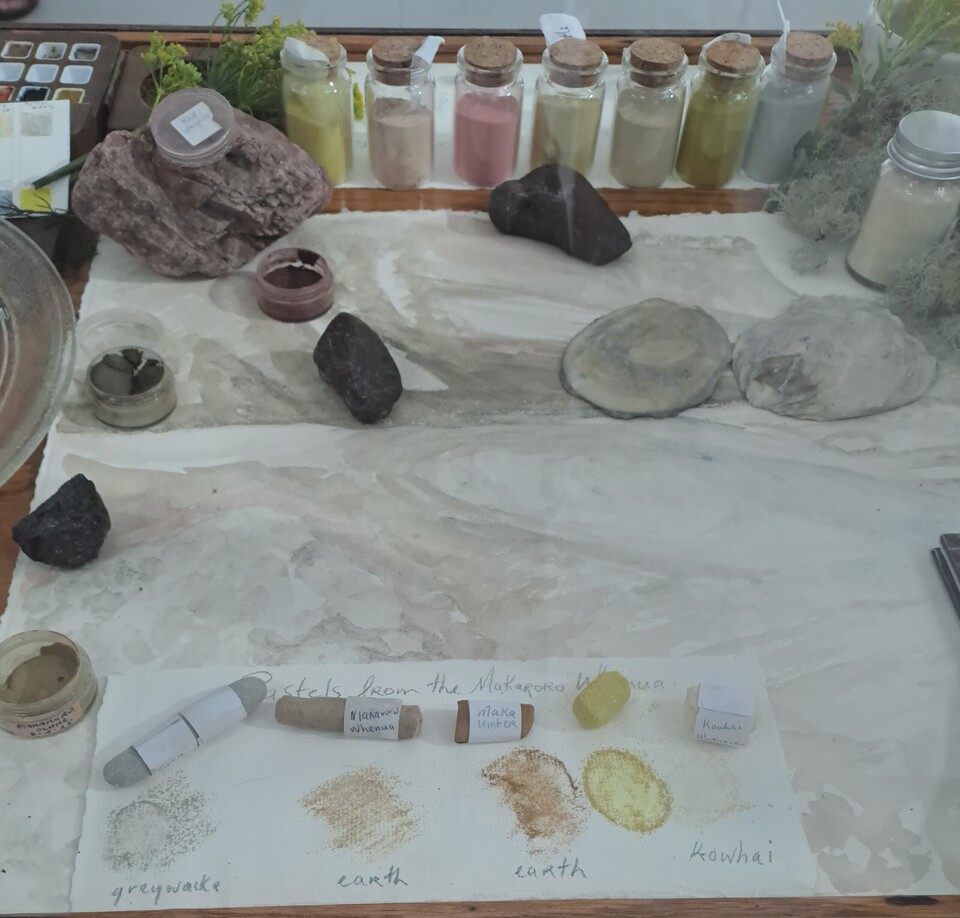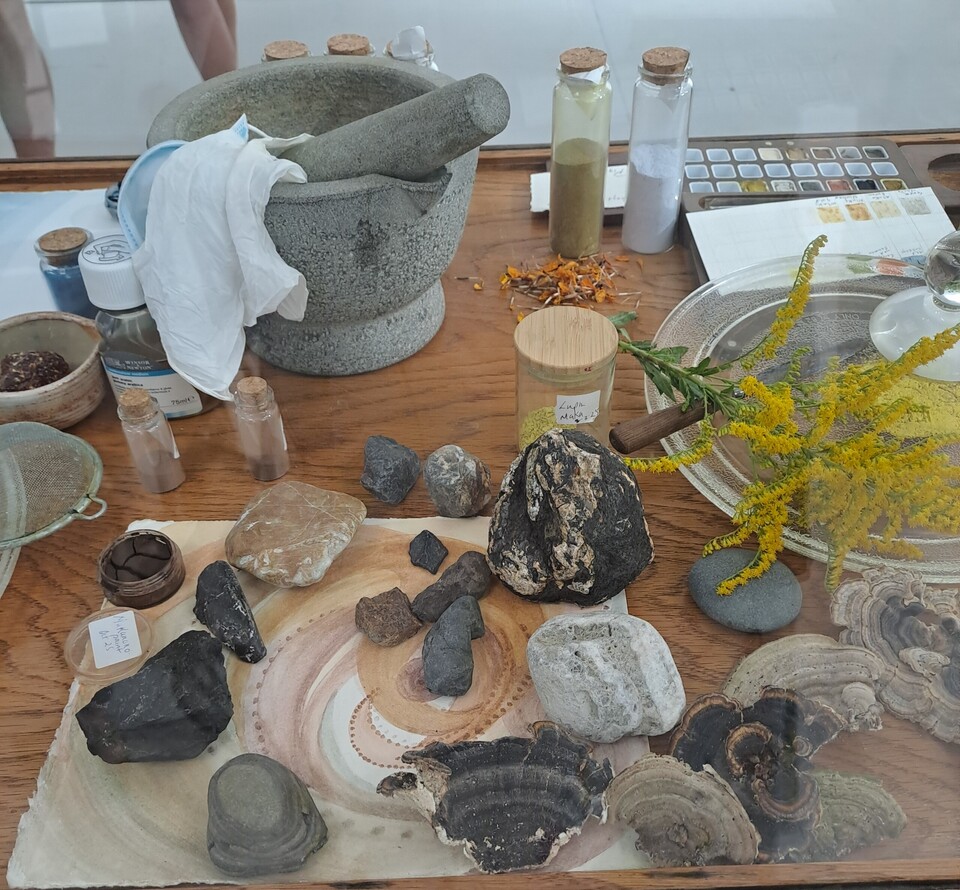 Some equipment, collected materials and hand made pigments, charcoal and pastels.